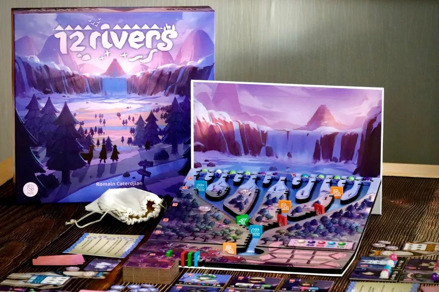 In this game you’re leading a tribe exploring twelve rivers that flow down from a mountain lake. Pearls sit at the top behind a floodgate, and once it’s removed, they…